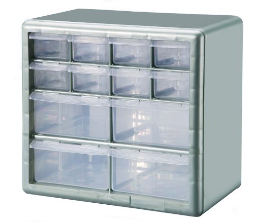 Stack-On's multi-drawer storage design can be used for storing a wide variety of parts and supplies. It has see-through drawers for quick identification of contents and has large ribbed drawer pulls for easier access to contents. This wide frame design provides for additional strength and rigidity and the drawer stop tabs prevent spills. This storage organizer easily mounts to any wall or can stand on your workbench or counter top. It contains 8 medium drawers and 4 large drawers.Multi-drawer design for storing a wide variety of parts and suppliesSee-through drawers for quick identification of contentsDrawer stop tabs prevent spillsEasily mounts to wall or stands on bench or counter topContains 8 medium drawers and 4 large drawers
