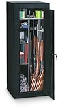 40 of 41 people found the following review helpful This review is from: Stack - On Convertible 18 - gun Cabinet (Misc.) I actually didn't buy my cabinet/safe from Amazon, but I thought my review would be helpful for those looking for a cabinet/safe.You have to put the shelving unit together yourself, but the good news about that is you don't have to be Tim "The Tool Man" Taylor to figure it out. The instructions are a good guide, but you can probably figure it out yourself without having to follow their step by step guide. There is a minimal amount of parts and it's pretty easy to identify what is what and what goes where. I did and I'm not the handiest guy around. This is a great gun cabinet/safe for the novice-average gun owner. Positives: The cabinet isn't too heavy (about 75-100 pounds) and if you need to move it around you won't kill yourself doing so. However, you do have the option to anchor this to something and there are pre-drilled holes for that in the cabinet. There's lots of storage space. I put my handguns and magazines on the shelves (8 handguns and numerous mags) and... Read more 15 of 15 people found the following review helpful Elliot - See all my reviews This review is from: Stack - On Convertible 18 - gun Cabinet (Misc.) This is a gun cabinet, not a safe. If you know this, you will be happy. You have 4 different ways of setting up the racks with this gun cabinet. You can set it up so you have lots of shelves with space for 3 long guns or no shelves with space for 15+ long guns. It has a basic lock on it to keep people out. With that said, locks only keep honest people out. It will not be a challenge to pry open for anyone armed with a simple screw driver and some time. If you only need to keep your firearms out of the way, this gun cabinet is a good way to go.Be advised that you obviously must set up the shelves yourself. This is not a difficult process, however, it is somewhat tedious and 2 people MAY be required to set this up. The instructions are minimalistic.. but they work. I looked at the diagrams provided and just kept working at it. Total set up time maybe 45 mins. Long story short.. decent quality gun cabinet with basic lock. I would buy it again if I needed to. 15 of 15 people found the following review helpful TMTMTl - See all my reviews Amazon Verified Purchase This review is from: Stack - On Convertible 18 - gun Cabinet (Misc.) As described it is an 18-gun cabinet. I have (1) 30-06 w/scope, (2) shotguns (1-12g, 1-20g), (1) M&P 15T w/scope, and (1) M&P 15-22 w/scope, a cleaning kit, (2) handguns, some ammo, (1) machete, and a few knives and the cabinet is about to overflow. It gets the job done for what I need however, it is definately not designed for several firearms at once. I bought it keep the kids away from the firearms and it does that but it's tight. I can see having to purcahse something a little bigger before long. I think this cabinet will make a good ammo storage cabinet. I would still recommend it. It is not meant to protect your firearms or anything else from a house fire and a dedicated thief but it's ok to keep the kids out. |